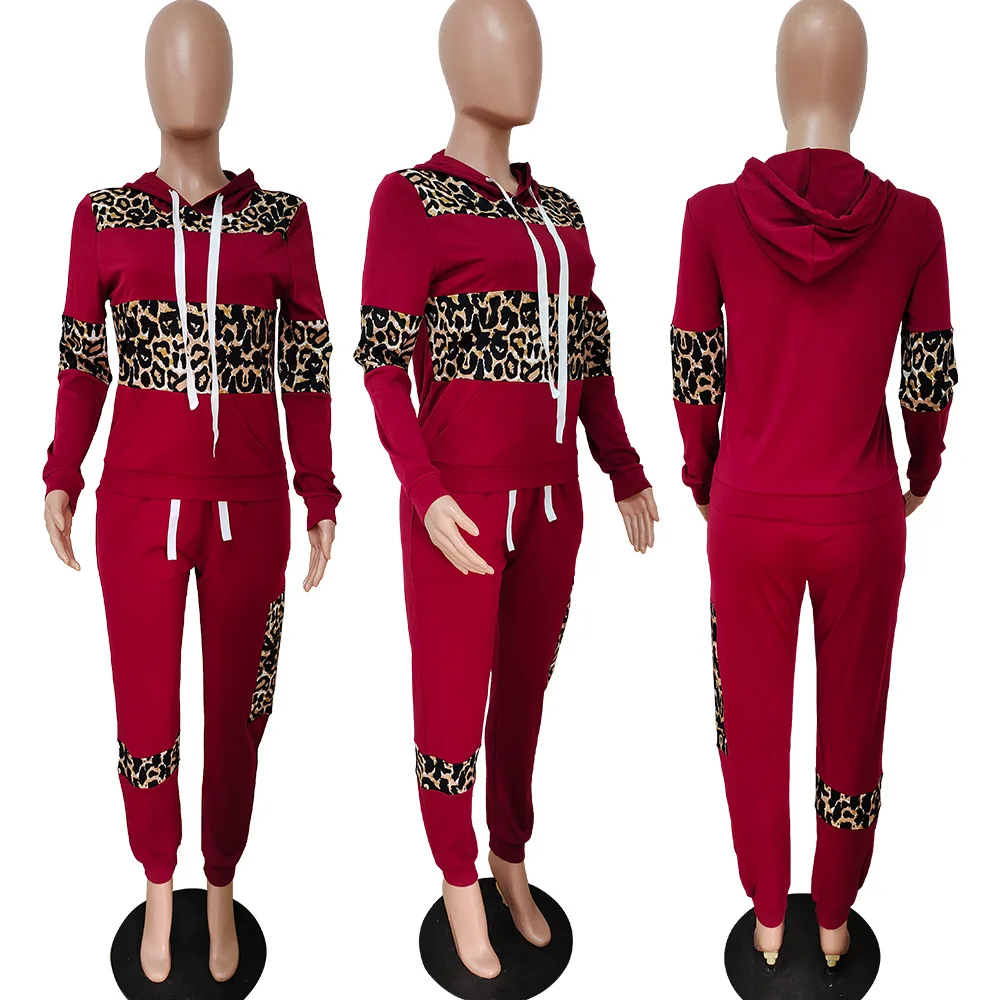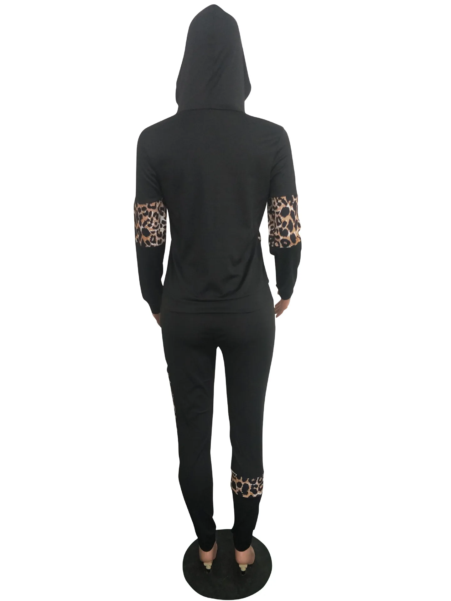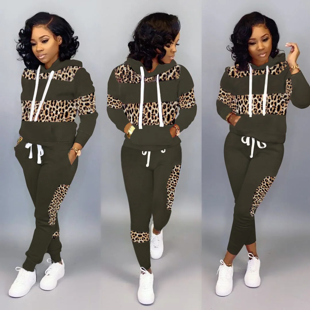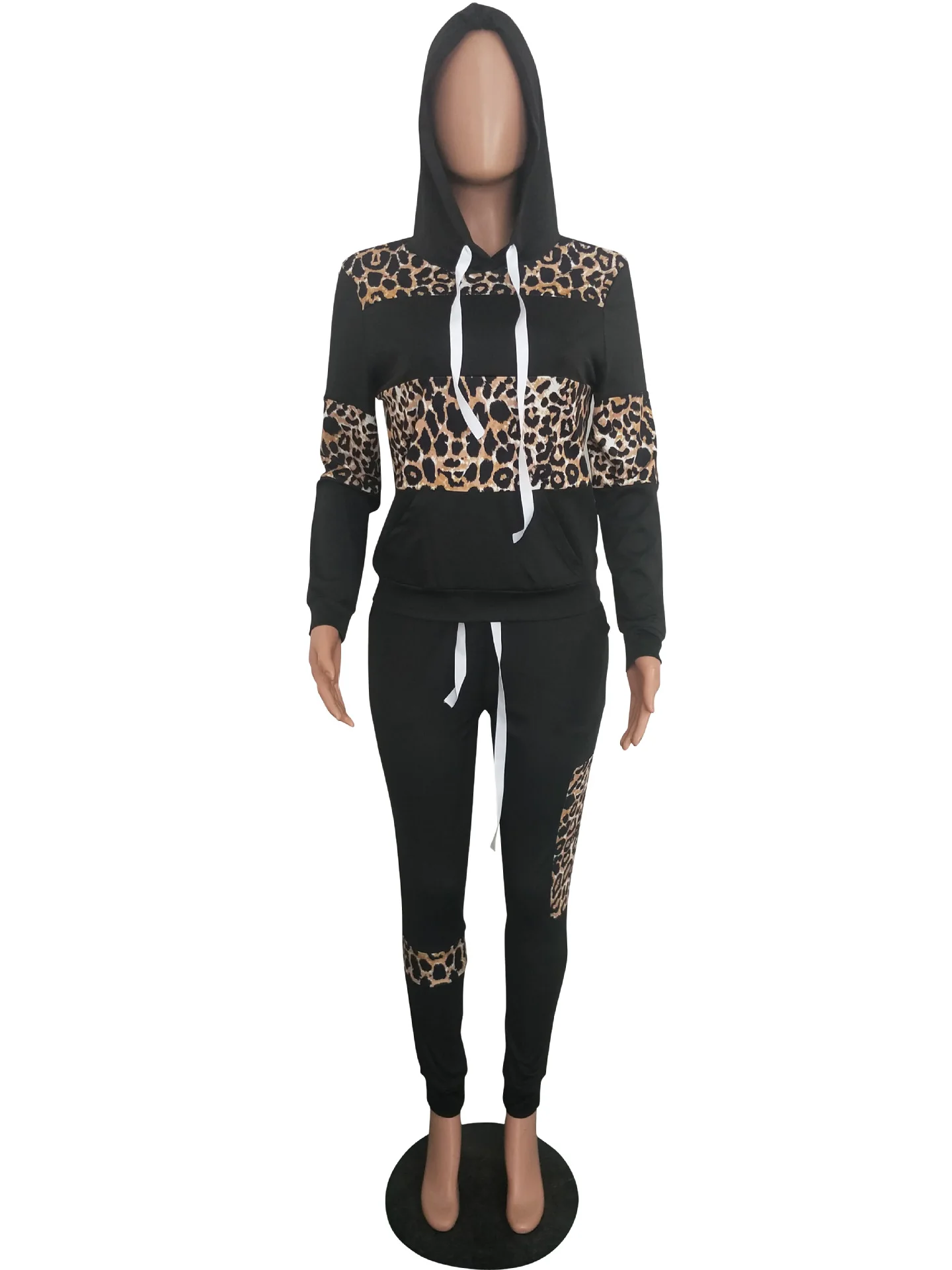 Fashion streetwear leopard patchwork print tracksuit sweatsuit women set Two piece set women hoodie+sweatpants matching outfits